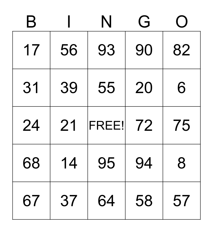 This bingo card has a free space and 24 words: 14, 37, 55, 67, 82, 17, 31, 56, 72, 95, 20, 24, 94, 8, 39, 58, 75, 93, 6, 21, 57, 68, 90 and 64.