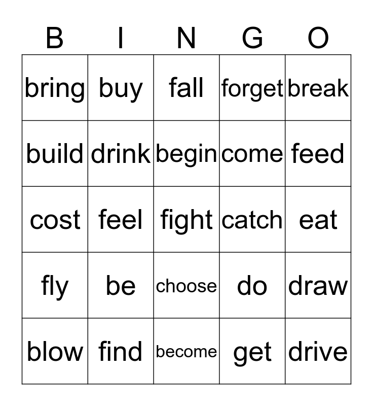 This bingo card has 25 words: be, become, begin, blow, break, bring, build, buy, catch, choose, come, cost, do, draw, drink, drive, eat, fall, feed, feel, fight, find, fly, forget and get.