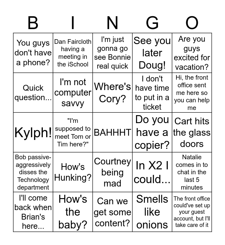 This bingo card has a free space and 24 words: How's Hunking?, How's the baby?, Where's Cory?, I'll come back when Brian's here..., Are you guys excited for vacation?, You guys don't have a phone?, Quick question..., Dan Faircloth having a meeting in the iSchool, Do you have a copier?, Courtney being mad, I don't have time to put in a ticket, Kylph!, In X2 I could..., Natalie comes in to chat in the last 5 minutes, I'm not computer savvy, Smells like onions, Cart hits the glass doors, I'm just gonna go see Bonnie real quick, Hi, the front office sent me here so you can help me, "I'm supposed to meet Tom or Tim here?", The front office could've set up your guest account, but I'll take care of it, Bob passive-aggressively disses the Technology department, See you later Doug! and Can we get some content?.