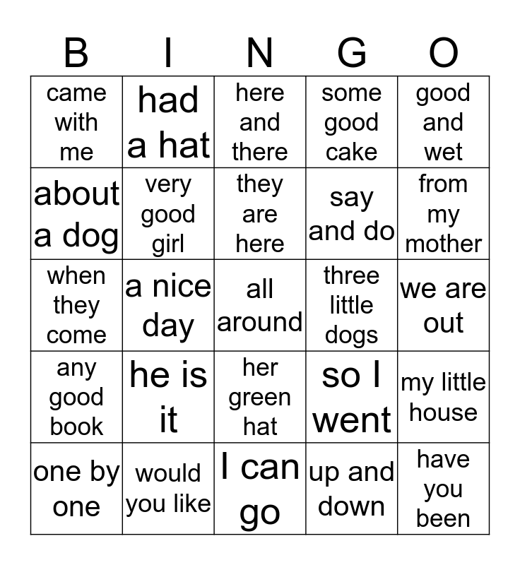 This bingo card has 25 words: he is it, I can go, they are here, one by one, good and wet, came with me, about a dog, had a hat, three little dogs, her green hat, say and do, when they come, so I went, my little house, very good girl, have you been, we are out, here and there, from my mother, a nice day, all around, would you like, any good book, some good cake and up and down.
