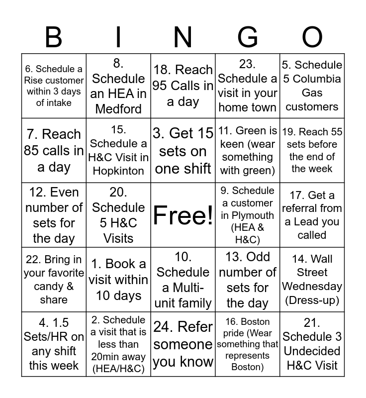 This bingo card has a free space and 24 words: 1. Book a visit within 10 days, 2. Schedule a visit that is less than 20min away (HEA/H&C), 3. Get 15 sets on one shift, 4. 1.5 Sets/HR on any shift this week, 5. Schedule 5 Columbia Gas customers, 6. Schedule a Rise customer within 3 days of intake, 7. Reach 85 calls in a day, 8. Schedule an HEA in Medford, 9. Schedule a customer in Plymouth (HEA & H&C), 10. Schedule a Multi-unit family, 11. Green is keen (wear something with green), 12. Even number of sets for the day, 13. Odd number of sets for the day, 14. Wall Street Wednesday (Dress-up), 15. Schedule a H&C Visit in Hopkinton, 16. Boston pride (Wear something that represents Boston), 17. Get a referral from a Lead you called, 18. Reach 95 Calls in a day, 19. Reach 55 sets before the end of the week, 20. Schedule 5 H&C Visits, 21. Schedule 3 Undecided H&C Visit, 22. Bring in your favorite candy & share, 23. Schedule a visit in your home town and 24. Refer someone you know.