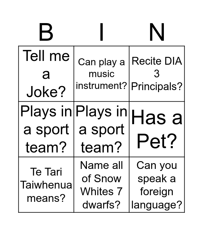 This bingo card has a free space and 8 words: Has a Pet?, Recite DIA 3 Principals?, Can play a music instrument?, Te Tari Taiwhenua means?, Tell me a Joke?, Can you speak a foreign language?, Plays in a sport team? and Name all of Snow Whites 7 dwarfs?.