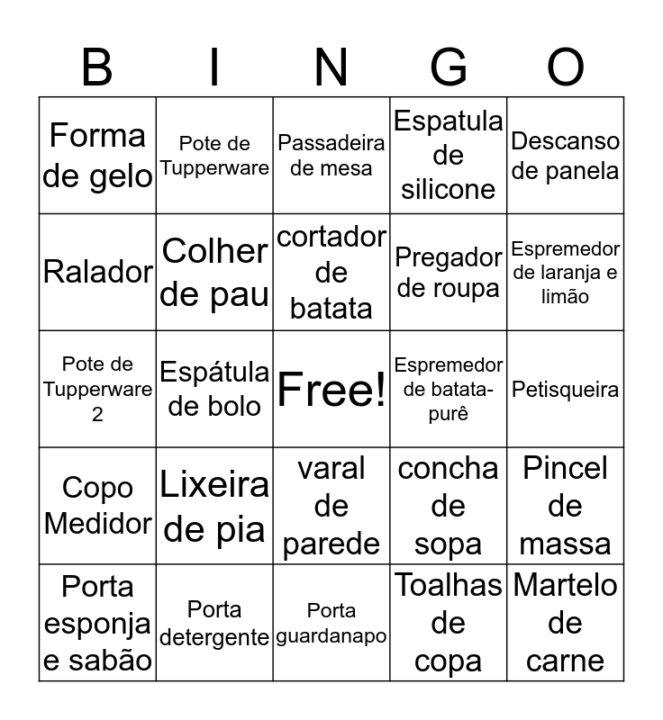 This bingo card has a free space and 36 words: Abridor de garrafa, Abridor de lata, Amaçador de alho, Colher de pau, concha de sopa, Copo Medidor, cortador de batata, Cortador de pizza, Descanso de panela, Descascador de legumes, Espátula de bolo, Espatula de silicone, Espremedor de alho, Espremedor de batata- purê, Espremedor de laranja e limão, Forma de gelo, Funil, Lixeira de pia, Martelo de carne, Passadeira de mesa, Petisqueira, Pincel de massa, Porta detergente, Porta esponja e sabão, Porta guardanapo, Pote de Tupperware, Pote de Tupperware 2, Potinhos para alimentos, Pregador de roupa, Ralador, Refratária pequena vidro, Tesoura, Toalhas de copa, varal de parede, Vassoura and Porta Tempeiro.