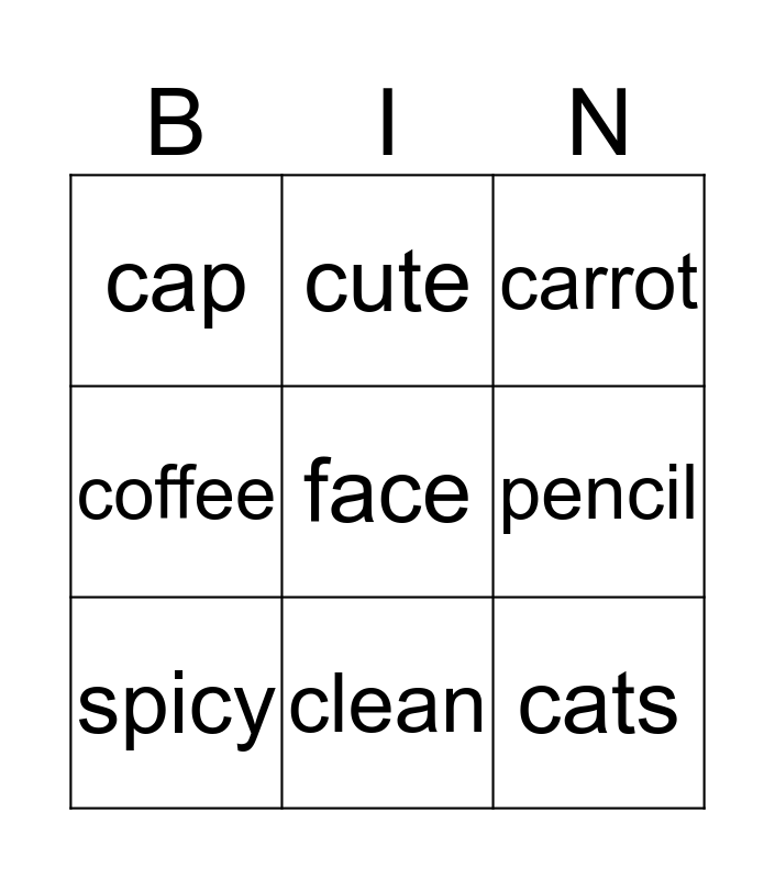 This bingo card has 12 words: mice, cats, face, pencil, cute, carrot, clean, car, cap, coffee, spicy and scissors.