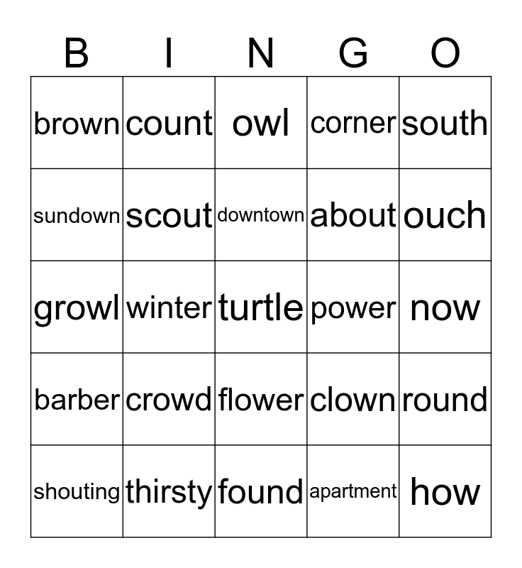 This bingo card has 25 words: crowd, found, downtown, shouting, south, brown, sundown, count, power, flower, about, growl, clown, round, scout, how, now, owl, ouch, winter, turtle, thirsty, barber, corner and apartment.