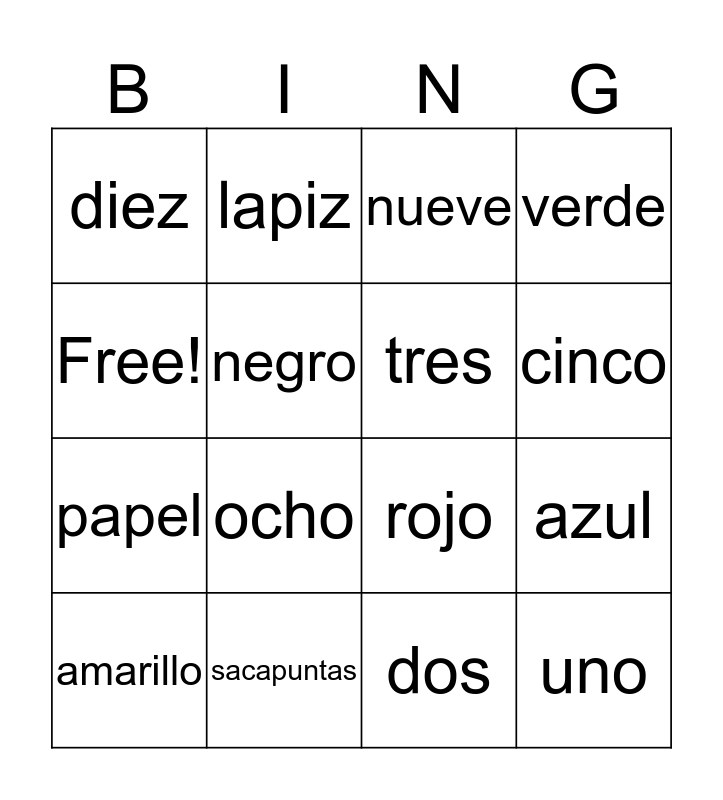 This bingo card has 16 words: sacapuntas, azul, nueve, diez, papel, lapiz, rojo, dos, Free!, negro, amarillo, verde, ocho, cinco, tres and uno.