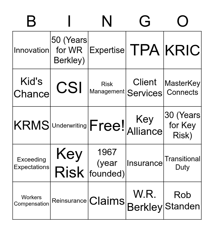 This bingo card has a free space and 24 words: Key Risk, Reinsurance, Risk Management, Workers Compensation, KRIC, Innovation, Kid's Chance, 50 (Years for WR Berkley), Key Alliance, 1967 (year founded), Client Services, KRMS, Insurance, Transitional Duty, CSI, W.R. Berkley, 30 (Years for Key Risk), Expertise, MasterKey Connects, Underwriting, Rob Standen, Exceeding Expectations, TPA and Claims.