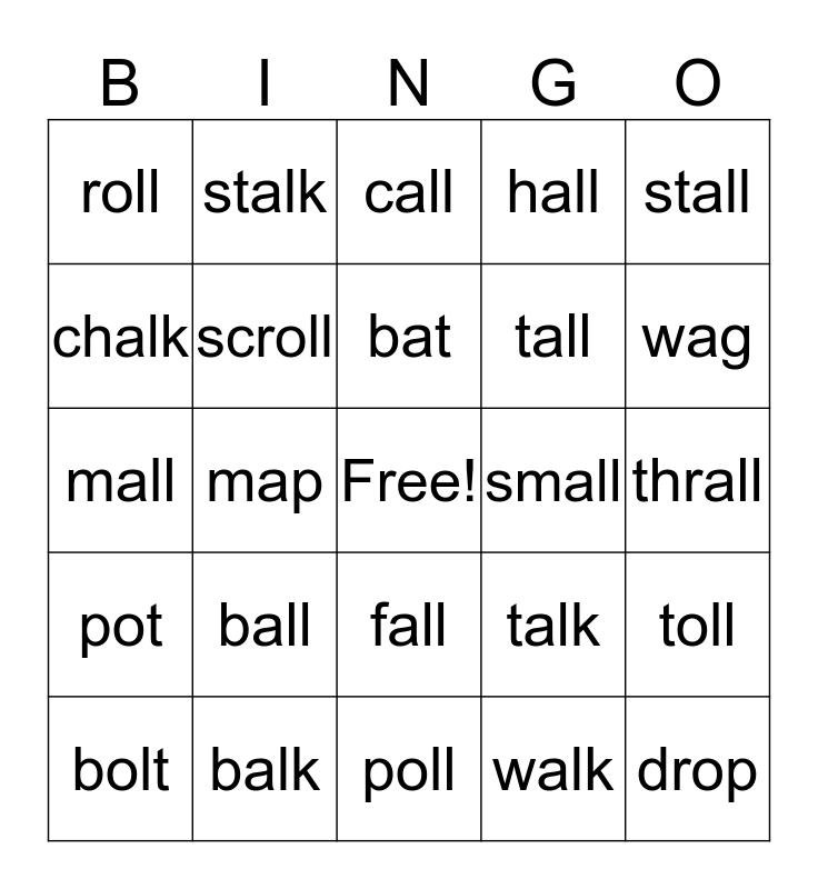 This bingo card has a free space and 24 words: ball, balk, bat, bolt, stall, roll, chalk, stalk, small, fall, tall, mall, talk, toll, scroll, walk, thrall, call, wag, map, drop, pot, hall and poll.