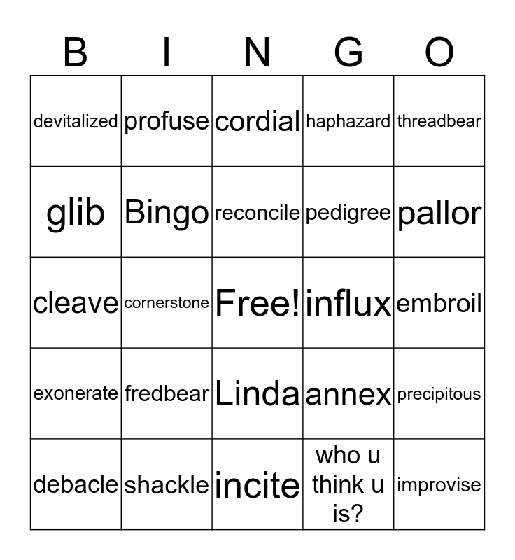 This bingo card has a free space and 24 words: fredbear, shackle, reconcile, debacle, threadbear, devitalized, glib, profuse, influx, Linda, pedigree, cleave, annex, precipitous, Bingo, who u think u is?, embroil, cordial, pallor, cornerstone, improvise, exonerate, haphazard and incite.