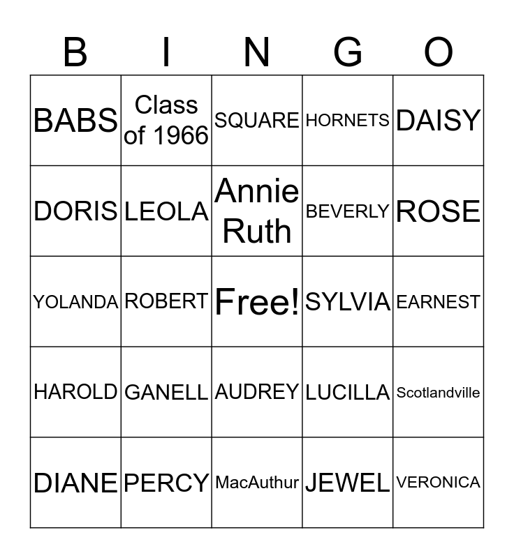 This bingo card has a free space and 29 words: DIANE, LINDA, ROBERT, CLARENCE, BABS, SQUARE, LEOLA, GANELL, SYLVIA, PERCY, EARNEST, VERONICA, MacAuthur, JEWEL, ROSE, MICHAEL, AUDREY, HAROLD, DAISY, YOLANDA, LUCILLA, MILDRED, BEVERLY, DORIS, HORNETS, Class of 1966, Scotlandville, Annie Ruth and May 24 1966.