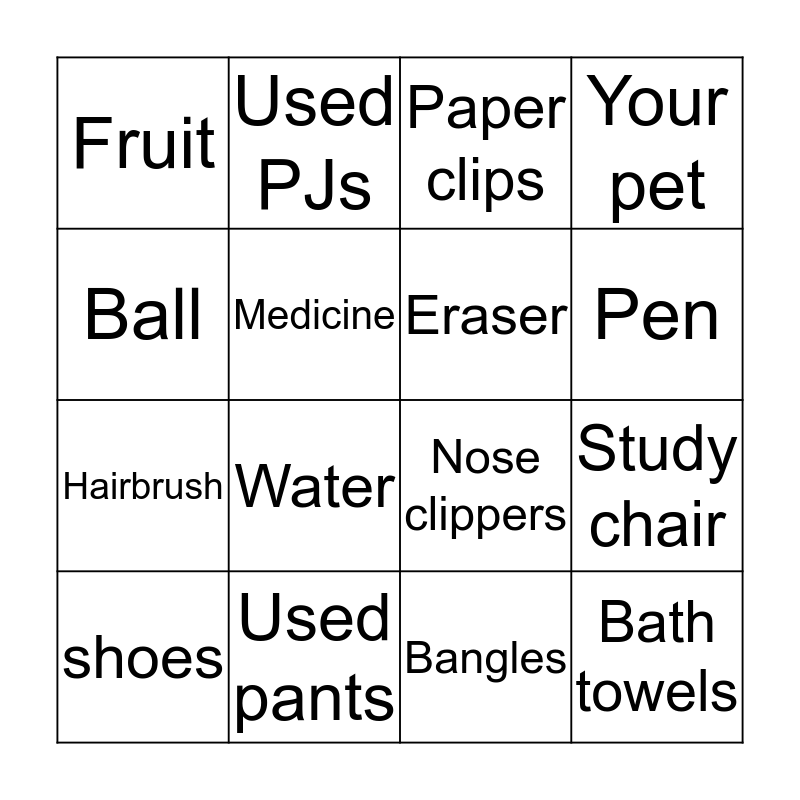 This bingo card has 61 words: Books, Toothbrush, Toys, Bath towels, Crayons, Pencils, Eraser, Used shirts, Hairbrush, Cubby, Your pet, Candy, Medicine, Shoes, Bed, Fruit, shoes, Ball, Reading glasses, Pen, Used pants, Paper clips, Eye drops, Glue, Ear drops, Handkerchief, Lunch box, Body sponge, Water, Scissors, bar soap, Lego Blocks, Playing mat, Razors, Used PJs, Earbuds, Study table, Study chair, Bar soap, Nose clippers, Gummy bear, Rubber band, Bangles, Lip balm, Hair band, Hair clips, Deodorant, New Shirt, Hair trimmer, Markers, Cookies, Phone charger, Notepad, Video game, Laptop, Paper napkin, Sketch pens, Drawing sheets, New pants, Cookies and Newspaper.