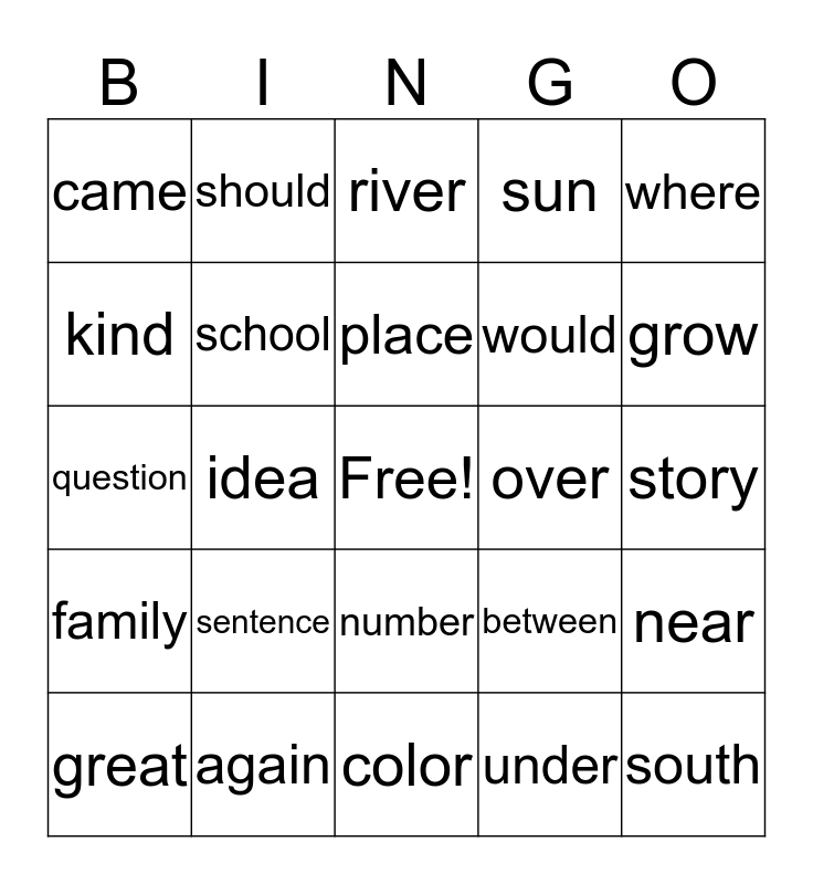 This bingo card has a free space and 24 words: sentence, again, place, great, where, came, kind, should, over, number, would, question, between, near, school, under, story, river, grow, idea, south, family, sun and color.