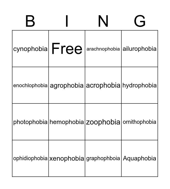 This bingo card has 16 words: xenophobia, ornithophobia, arachnophobia, cynophobia, photophobia, Free, zoophobia, graphophboia, enochlophobia, agrophobia, ophidiophobia, ailurophobia, hemophobia, hydrophobia, acrophobia and Aquaphobia.