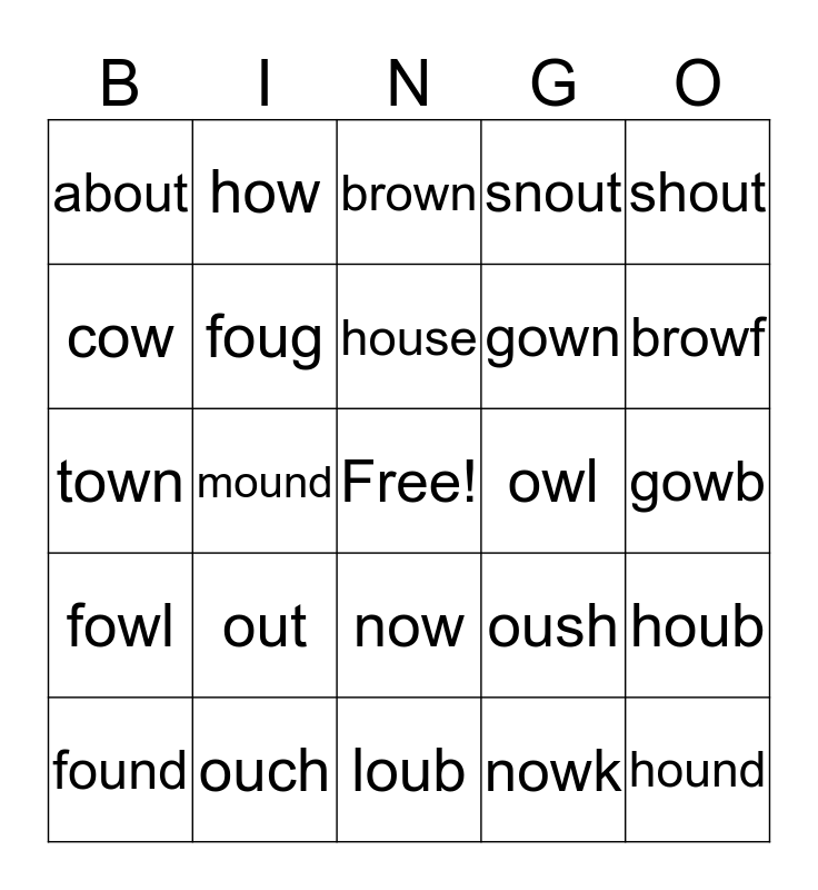 This bingo card has a free space and 24 words: out, ouch, house, found, shout, about, cow, how, owl, now, gown, town, oush, houb, foug, nowk, gowb, brown, browf, mound, hound, fowl, snout and loub.