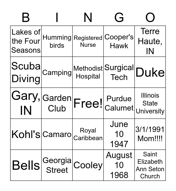 This bingo card has a free space and 24 words: Camaro, Georgia Street, Methodist Hospital, Bells, Terre Haute, IN, Lakes of the Four Seasons, Scuba Diving, Humming birds, Purdue Calumet, Royal Caribbean, Surgical Tech, Gary, IN, June 10 1947, 3/1/1991 Mom!!!!, Camping, August 10 1968, Illinois State University, Registered Nurse, Duke, Garden Club, Saint Elizabeth Ann Seton Church, Kohl's, Cooper's Hawk and Cooley.