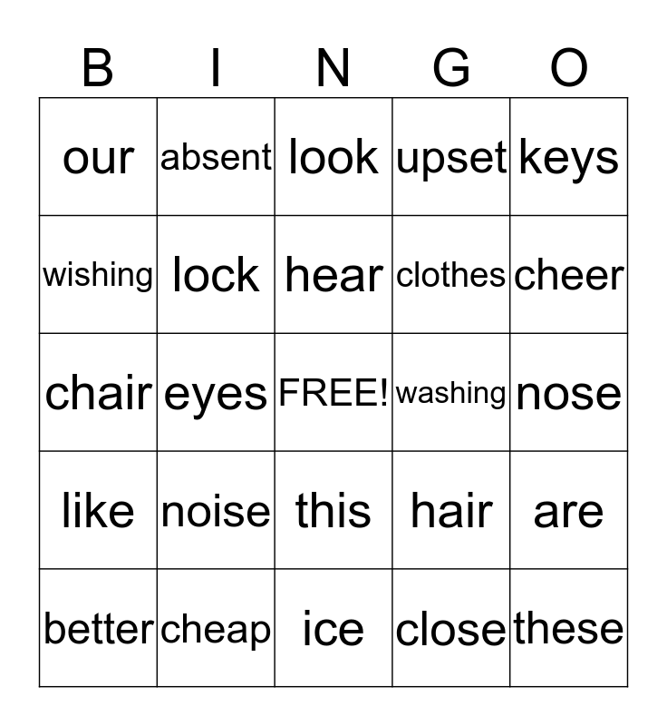 This bingo card has a free space and 24 words: noise, cheap, hear, better, keys, our, wishing, absent, washing, this, clothes, chair, hair, are, lock, close, nose, look, cheer, eyes, these, like, upset and ice.