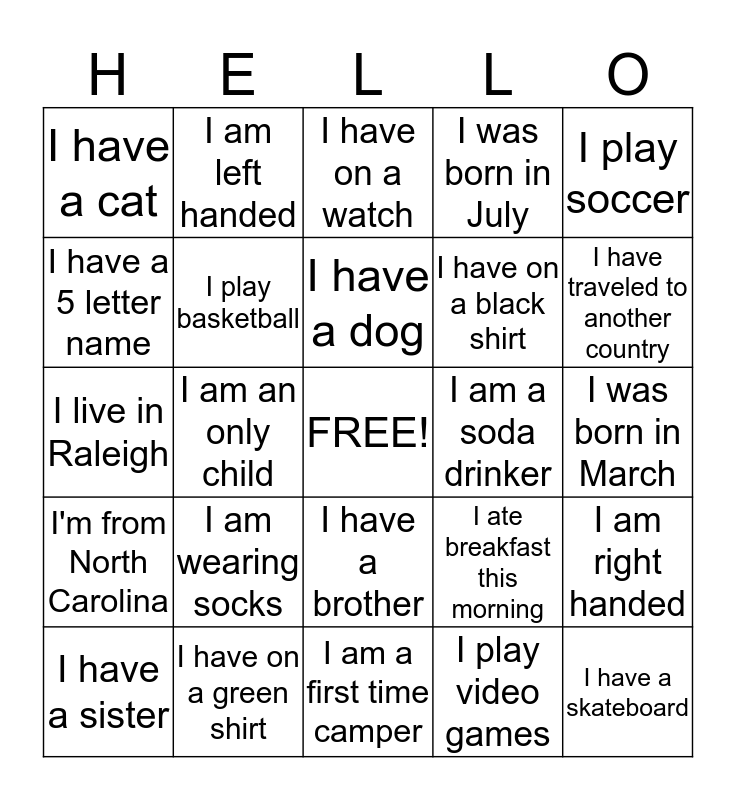 This bingo card has a free space and 24 words: I am wearing socks, I have on a green shirt, I have a dog, I have a sister, I play soccer, I have a cat, I have a 5 letter name, I am left handed, I am a soda drinker, I have a brother, I have on a black shirt, I live in Raleigh, I ate breakfast this morning, I am right handed, I play basketball, I play video games, I was born in March, I have on a watch, I have traveled to another country, I am an only child, I have a skateboard, I'm from North Carolina, I was born in July and I am a first time camper.