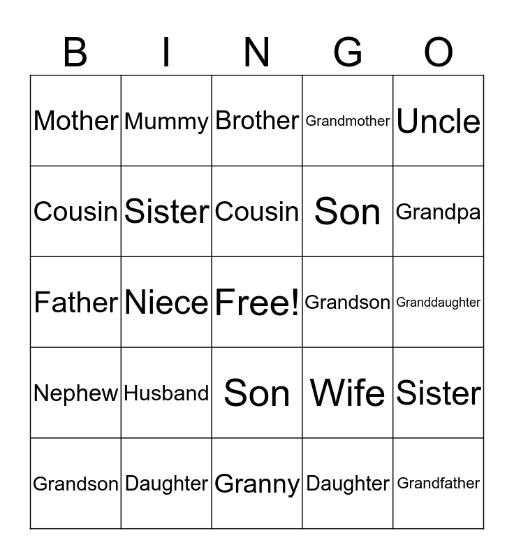 This bingo card has a free space and 40 words: Mother, Father, Brother, Sister, Daughter, Son, Cousin, Aunt, Uncle, Nephew, Niece, Grandmother, Grandfather, Granddaughter, Grandson, Husband, Wife, Mother, Father, Brother, Sister, Daughter, Son, Cousin, Aunt, Uncle, Nephew, Niece, Grandma, Grandad, Granddaughter, Grandson, Husband, Wife, Grandpa, Granny, Grandfather, Grandmother, Mummy and Daddy.