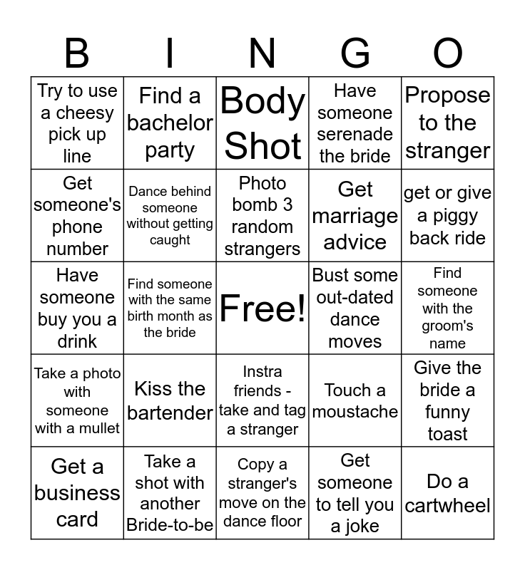 This bingo card has a free space and 24 words: Kiss the bartender, Take a shot with another Bride-to-be, Photo bomb 3 random strangers, Get a business card, Propose to the stranger, Try to use a cheesy pick up line, Get someone's phone number, Find a bachelor party, Bust some out-dated dance moves, Instra friends - take and tag a stranger, Get marriage advice, Have someone buy you a drink, Touch a moustache, Give the bride a funny toast, Dance behind someone without getting caught, Get someone to tell you a joke, Find someone with the groom's name, Body Shot, get or give a piggy back ride, Find someone with the same birth month as the bride, Do a cartwheel, Take a photo with someone with a mullet, Have someone serenade the bride and Copy a stranger's move on the dance floor.