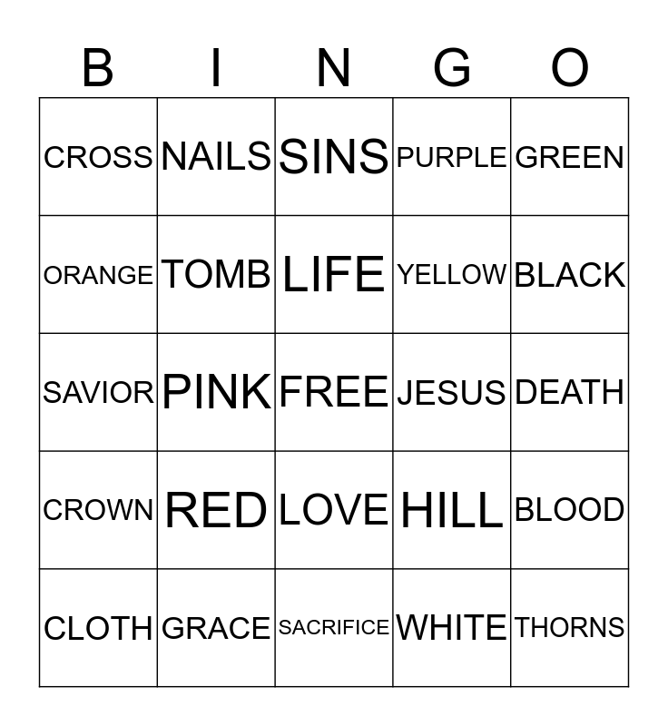 This bingo card has a free space and 24 words: RED, GRACE, LIFE, CLOTH, GREEN, CROSS, ORANGE, NAILS, JESUS, LOVE, YELLOW, SAVIOR, HILL, BLOOD, TOMB, WHITE, DEATH, SINS, BLACK, PINK, THORNS, CROWN, PURPLE and SACRIFICE.