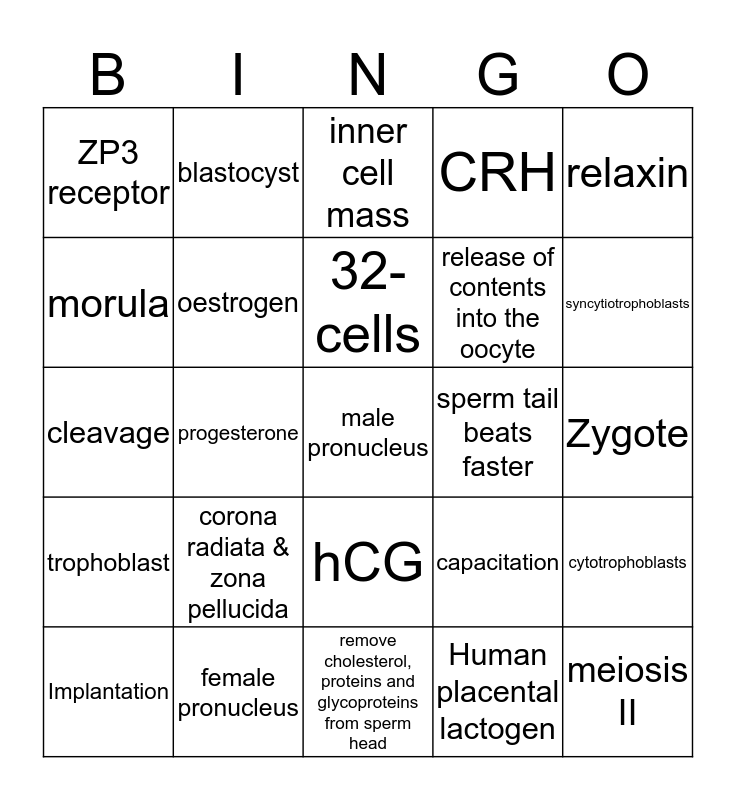 This bingo card has 25 words: corona radiata & zona pellucida, remove cholesterol, proteins and glycoproteins from sperm head, 32-cells, Implantation, relaxin, ZP3 receptor, morula, blastocyst, sperm tail beats faster, hCG, release of contents into the oocyte, cleavage, capacitation, cytotrophoblasts, oestrogen, meiosis II, Zygote, inner cell mass, syncytiotrophoblasts, progesterone, male pronucleus, female pronucleus, trophoblast, CRH and Human placental lactogen.