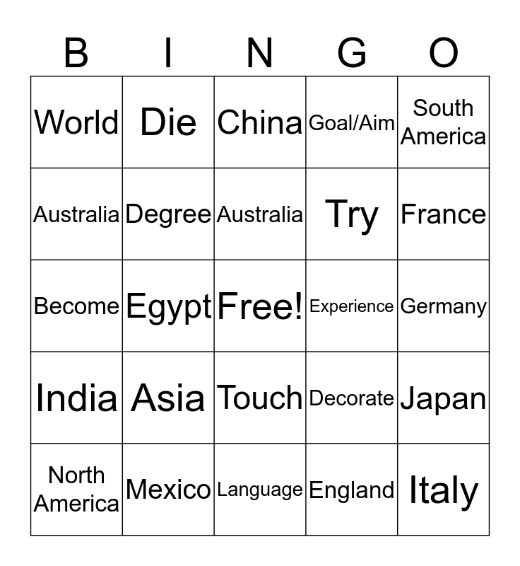 This bingo card has a free space and 24 words: Asia, Mexico, Australia, North America, South America, World, Australia, Die, Experience, Touch, Try, Become, Decorate, Japan, Degree, England, Germany, China, France, Egypt, Italy, India, Goal/Aim and Language.
