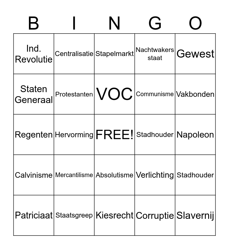 This bingo card has a free space and 32 words: Corruptie, Katholicisme, Hervorming, Lutheranisme, Calvinisme, Protestanten, Gewest, Stadhouder, Centralisatie, Republiek, VOC, Stapelmarkt, Nijverheid, Staten, Stadhouder, Raads pensionaris, Patriciaat, Regenten, Absolutisme, Mercantilisme, Verlichting, Franse revolutie, Napoleon, Staatsgreep, Slavernij, Nachtwakers staat, Communisme, Staten Generaal, Ind. Revolutie, Kiesrecht, Conservatisme and Vakbonden.
