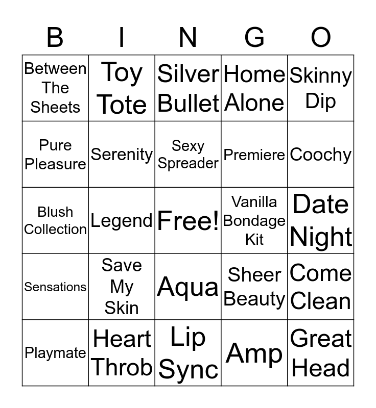 This bingo card has a free space and 24 words: Save My Skin, Heart Throb, Sexy Spreader, Playmate, Skinny Dip, Between The Sheets, Pure Pleasure, Toy Tote, Vanilla Bondage Kit, Aqua, Premiere, Blush Collection, Sheer Beauty, Come Clean, Serenity, Amp, Date Night, Silver Bullet, Coochy, Legend, Great Head, Sensations, Home Alone and Lip Sync.