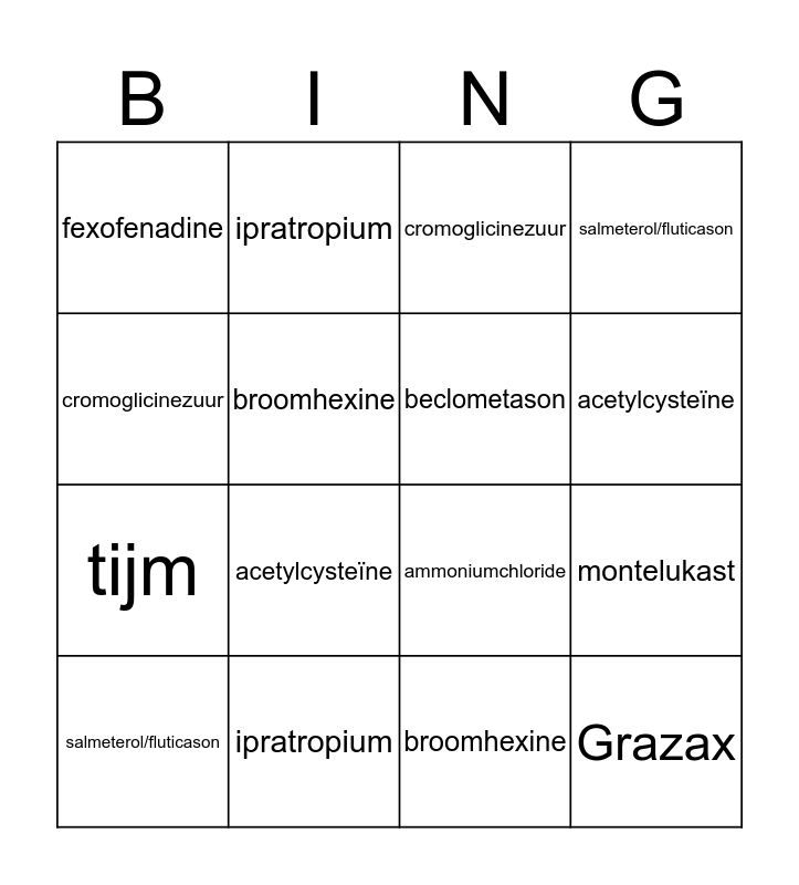 This bingo card has 31 words: Free!, codeïne, montelukast, Grazax, fexofenadine, cromoglicinezuur, beclometason, salbutamol, ipratropium, tijm, broomhexine, salmeterol/fluticason, ammoniumchloride, prednisolon, acetylcysteïne, hydroxyzine, codeïne, montelukast, Grazax, fexofenadine, cromoglicinezuur, beclometason, salbutamol, ipratropium, tijm, broomhexine, salmeterol/fluticason, ammoniumchloride, prednisolon, acetylcysteïne and hydroxyzine.