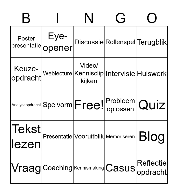 This bingo card has a free space and 39 words: Zoekopdracht, Wikken en wegen, Werkopdracht, Weblecture, Vraag, Vooruitblik, Video/ Kennisclip kijken, Uitleggen, Terugblik, Tekst lezen, Spelvorm, Rollenspel, Reflectie opdracht, Quiz, Probleem oplossen, Presentatie, Praktijk/ werkplek, Poster presentatie, Mindmap, Memoriseren, Keuze-opdracht, Kennismaking, Intervisie, Huiswerk, Groepsopdracht, Foto-opdracht, Focus, Filmen, Feedback, Eye-opener, Evalueren, E-Learning, Discussie, Coaching, Casus, Brainstorm, Blog, Analyseopdracht and Aanpassen.