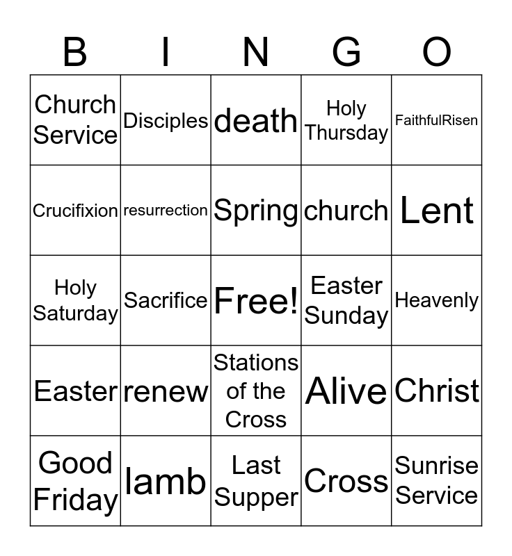 This bingo card has a free space and 28 words: Christ, Christian, church, Cross, Crucifixion, death, Disciples, Easter, Easter Sunday, Good Friday, Holy Saturday, Holy Thursday, lamb, Last Supper, Lent, prayer, renew, resurrection, Spring, Stations of the Cross, Church Service, Tomb, Sunrise Service, Sacrifice, Heavenly, Alive, FaithfulRisen and Religious.