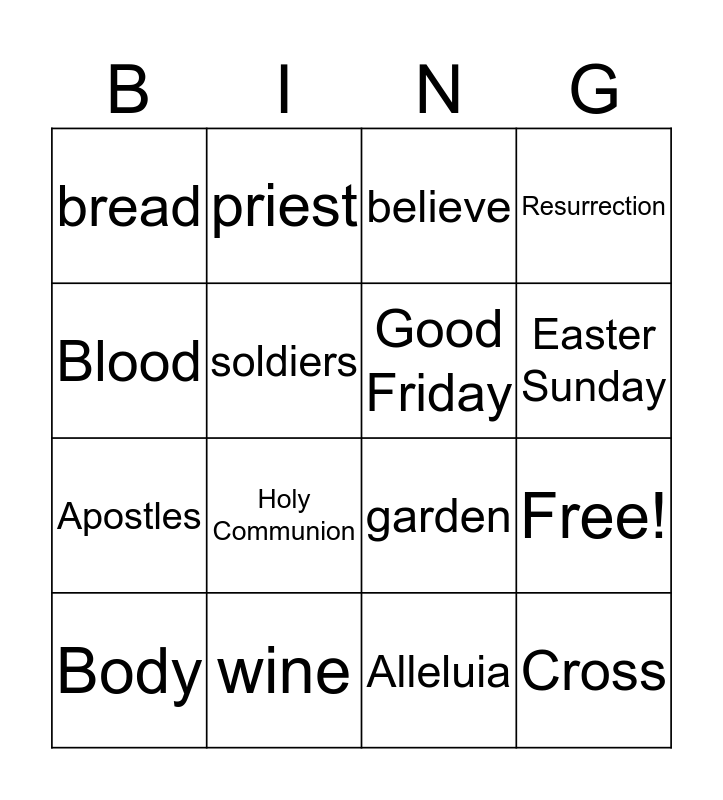 This bingo card has 20 words: Free!, miracle, believe, Last Supper, Body, Blood, wine, bread, Apostles, priest, Holy Communion, garden, soldiers, Cross, Good Friday, Heaven, Easter Sunday, Resurrection, Alleluia and palm.
