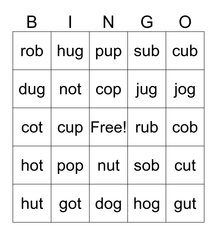 This bingo card has a free space and 24 words: pop, got, cop, hut, cub, rob, dug, hug, rub, nut, jug, cot, sob, cut, not, hog, cob, pup, jog, cup, gut, hot, sub and dog.