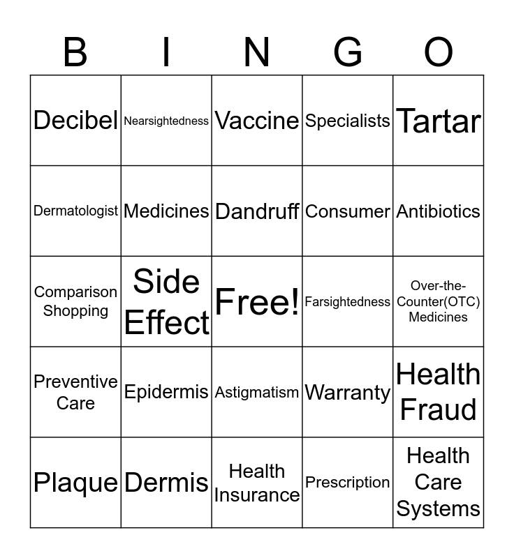 This bingo card has a free space and 24 words: Epidermis, Dermis, Dandruff, Plaque, Tartar, Decibel, Dermatologist, Nearsightedness, Farsightedness, Astigmatism, Consumer, Comparison Shopping, Warranty, Health Fraud, Medicines, Prescription, Over-the-Counter(OTC) Medicines, Vaccine, Antibiotics, Side Effect, Health Care Systems, Preventive Care, Specialists and Health Insurance.