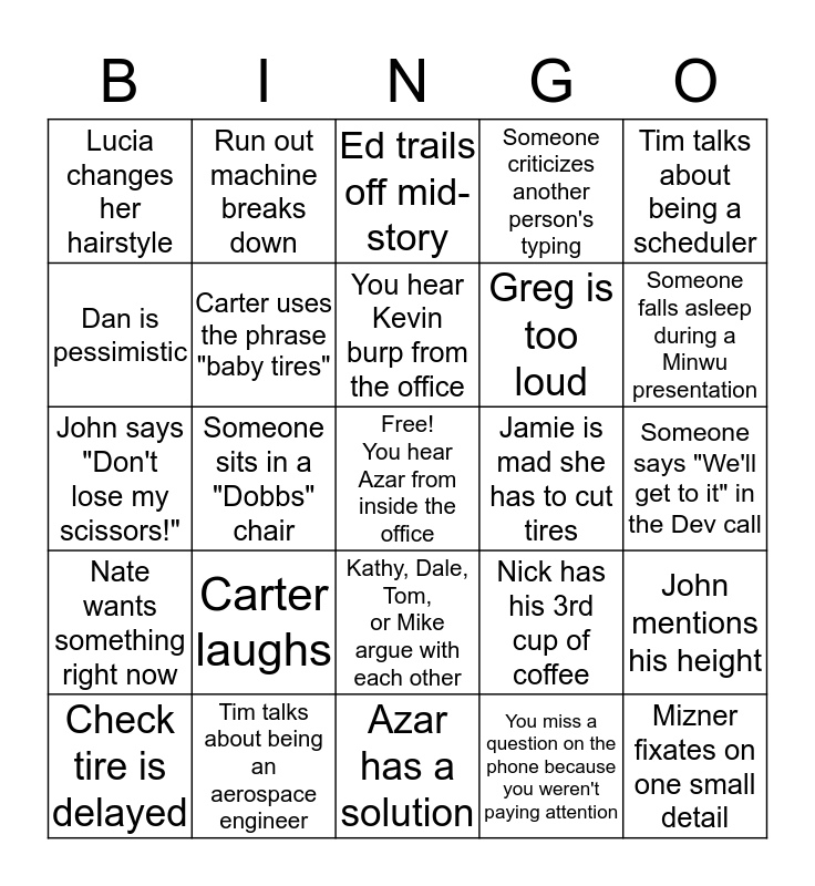 This bingo card has a free space and 24 words: Carter laughs, Tim talks about being an aerospace engineer, You hear Kevin burp from the office, Check tire is delayed, Tim talks about being a scheduler, Lucia changes her hairstyle, Dan is pessimistic, Run out machine breaks down, Jamie is mad she has to cut tires, Kathy, Dale, Tom, or Mike argue with each other, Greg is too loud, John says "Don't lose my scissors!", Nick has his 3rd cup of coffee, John mentions his height, Carter uses the phrase "baby tires", You miss a question on the phone because you weren't paying attention, Someone says "We'll get to it" in the Dev call, Ed trails off mid-story, Someone falls asleep during a Minwu presentation, Someone sits in a "Dobbs" chair, Mizner fixates on one small detail, Nate wants something right now, Someone criticizes another person's typing and Azar has a solution.