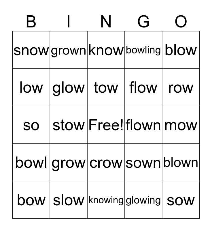 This bingo card has a free space and 24 words: grow, slow, tow, bow, blow, snow, low, grown, flown, crow, flow, so, sown, blown, glow, glowing, mow, know, row, stow, sow, bowl, bowling and knowing.
