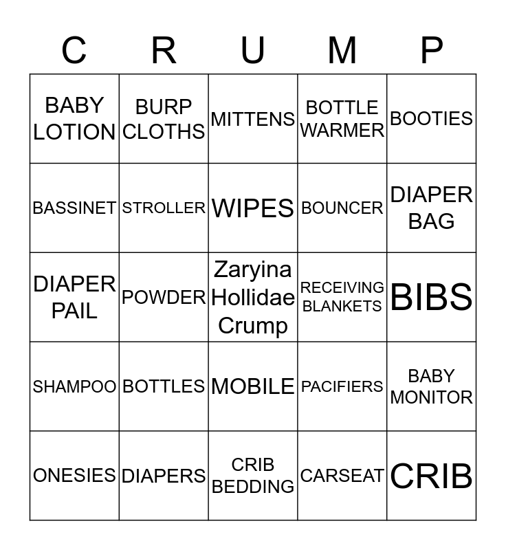 This bingo card has a free space and 24 words: BOTTLES, DIAPERS, WIPES, ONESIES, BOOTIES, BABY LOTION, BASSINET, BURP CLOTHS, RECEIVING BLANKETS, MOBILE, BOUNCER, DIAPER PAIL, PACIFIERS, BABY MONITOR, STROLLER, CARSEAT, BIBS, MITTENS, DIAPER BAG, POWDER, CRIB, SHAMPOO, BOTTLE WARMER and CRIB BEDDING.