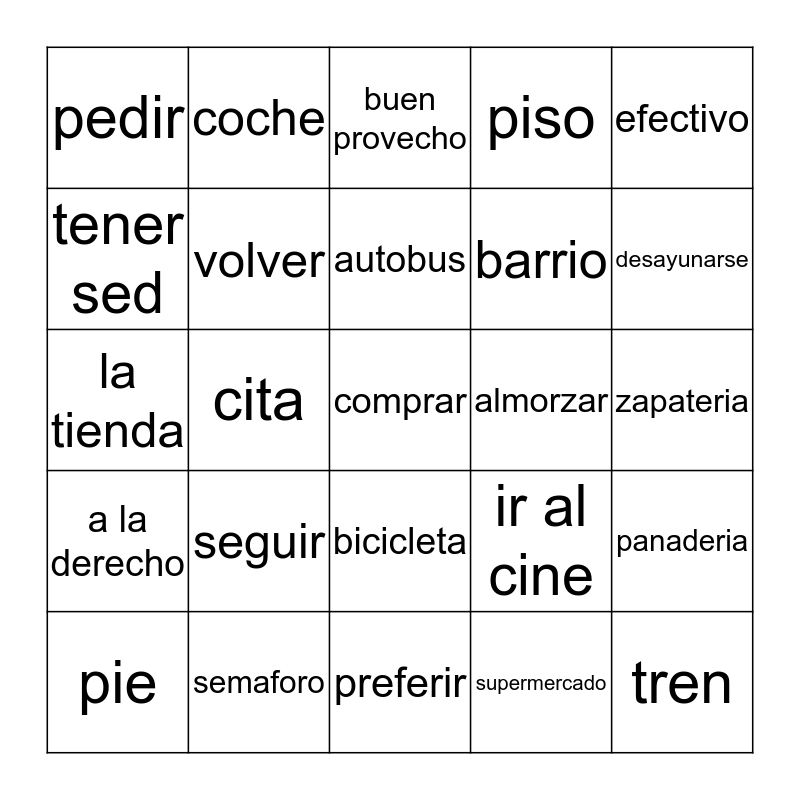 This bingo card has 48 words: perdon, comprar, me gustaria, preferir, seguir, avion, coche, cuenta, tener sed, cocinar, volver, piso, panaderia, ir al cine, patineta, carniceria, autobus, almorzar, caballo, efectivo, cita, supermercado, pedir, barrio, el primer piso, desayunarse, pie, a la izquierda, bicicleta, a la derecho, ir a un hotel, monopatin, cenar, pagar, semaforo, libreria, continuar, zapateria, jugar un juego, calle, beber, tren, buen provecho, para, la tienda, ir, joyeria and metro.