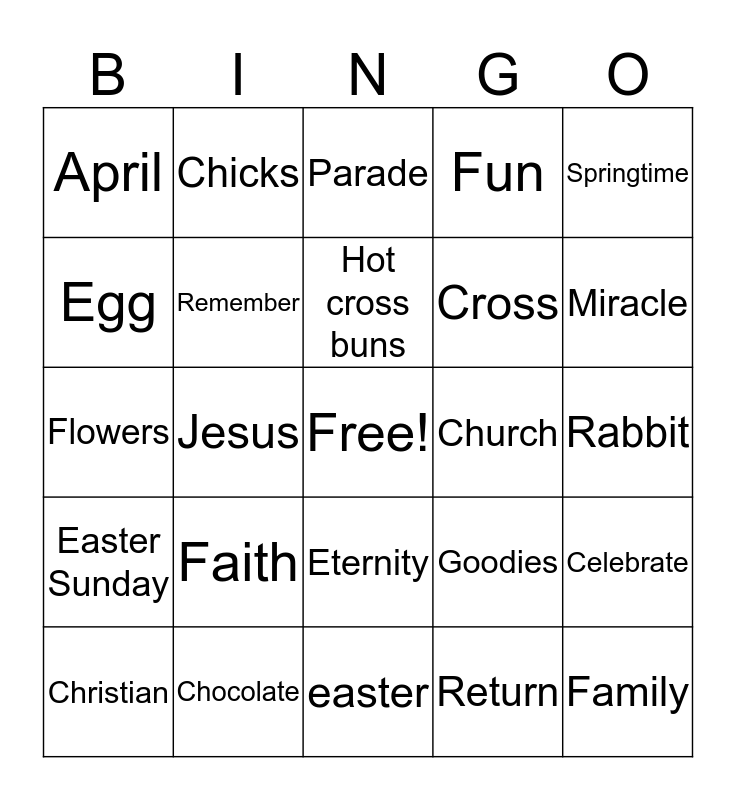 This bingo card has a free space and 24 words: Faith, Chocolate, Hot cross buns, Christian, Springtime, April, Egg, Chicks, Church, Eternity, Cross, Flowers, Goodies, Celebrate, Remember, Return, Rabbit, Parade, Miracle, Jesus, Family, Easter Sunday, Fun and easter.