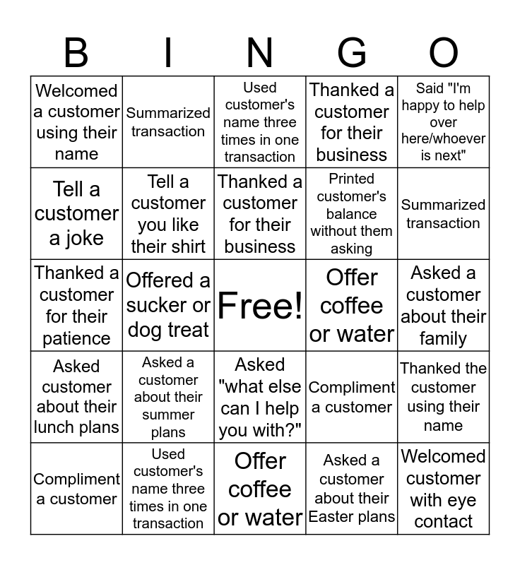 This bingo card has a free space and 24 words: Asked a customer about their summer plans, Used customer's name three times in one transaction, Thanked a customer for their business, Compliment a customer, Said "I'm happy to help over here/whoever is next", Welcomed a customer using their name, Tell a customer a joke, Summarized transaction, Offer coffee or water, Asked "what else can I help you with?", Printed customer's balance without them asking, Thanked a customer for their patience, Compliment a customer, Thanked the customer using their name, Tell a customer you like their shirt, Asked a customer about their Easter plans, Asked a customer about their family, Used customer's name three times in one transaction, Summarized transaction, Offered a sucker or dog treat, Welcomed customer with eye contact, Asked customer about their lunch plans, Thanked a customer for their business and Offer coffee or water.