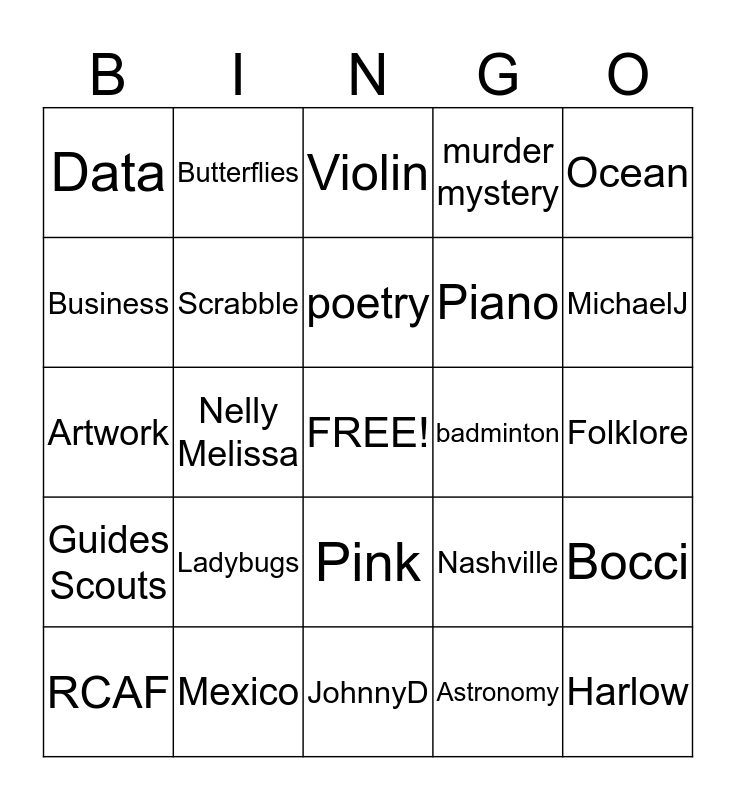 This bingo card has a free space and 24 words: Ladybugs, Mexico, poetry, RCAF, Ocean, Data, Business, Butterflies, badminton, Pink, Piano, Artwork, Nashville, Bocci, Scrabble, Astronomy, Folklore, Violin, MichaelJ, Nelly Melissa, Harlow, Guides Scouts, murder mystery and JohnnyD.