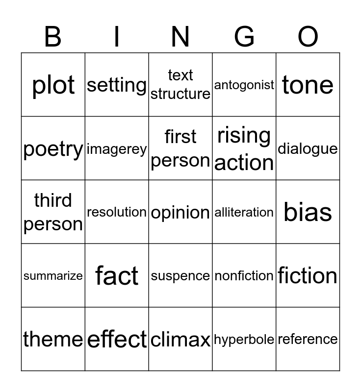 This bingo card has a free space and 24 words: fact, effect, first person, theme, tone, plot, poetry, setting, alliteration, suspence, rising action, third person, nonfiction, fiction, imagerey, hyperbole, bias, text structure, dialogue, resolution, reference, summarize, antogonist and climax.