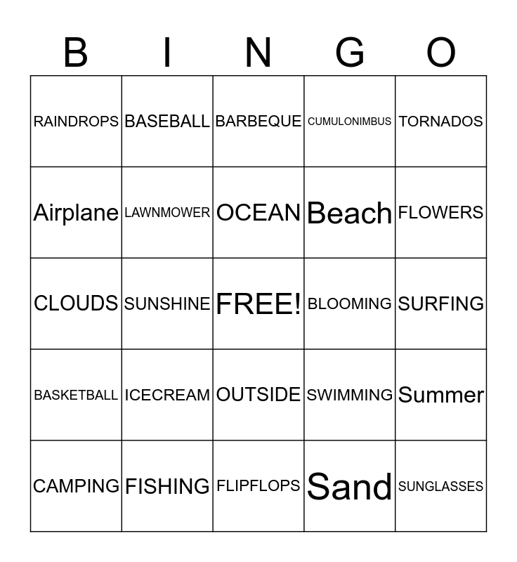 This bingo card has a free space and 28 words: Summer, Swimming Pool, Beach, Sand, Airplane, BARBEQUE, BASEBALL, BASKETBALL, BLOOMING, CAMPING, CLOUDS, CUMULONIMBUS, FISHING, FLIPFLOPS, FLOWERS, HUMIDITY, ICECREAM, LAWNMOWER, OCEAN, OUTSIDE, RAINDROPS, STORMS, SUNGLASSES, SUNSHINE, SURFING, SWIMMING, TORNADOS and VACATION.