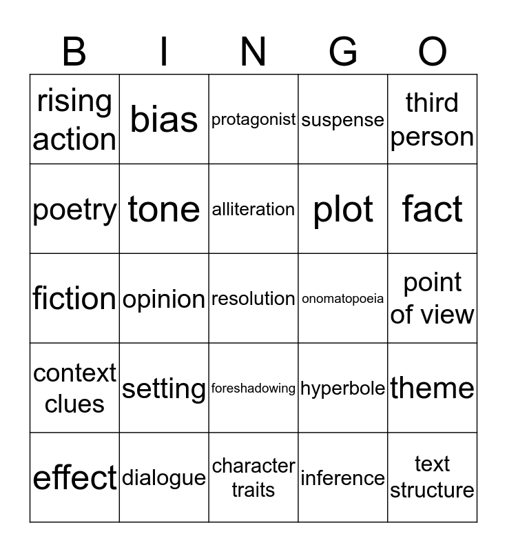 This bingo card has a free space and 24 words: setting, dialogue, alliteration, effect, third person, rising action, poetry, bias, onomatopoeia, foreshadowing, plot, fiction, hyperbole, theme, tone, inference, point of view, protagonist, fact, opinion, text structure, context clues, suspense and character traits.