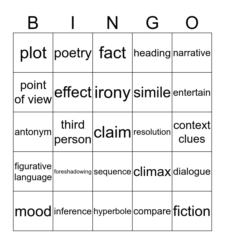 This bingo card has a free space and 24 words: foreshadowing, inference, irony, mood, narrative, plot, point of view, poetry, resolution, sequence, simile, antonym, climax, dialogue, effect, compare, context clues, fact, entertain, third person, fiction, figurative language, heading and hyperbole.