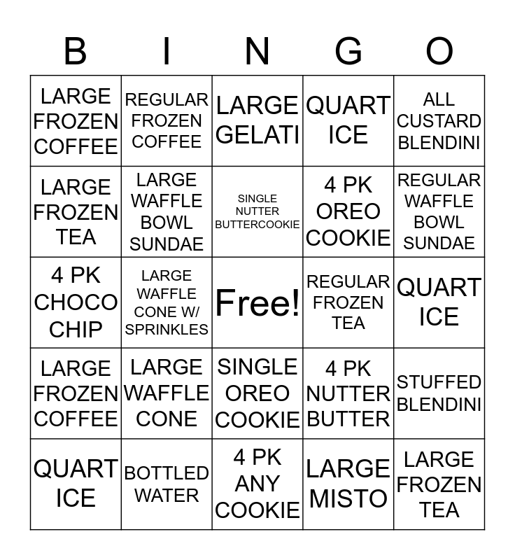 This bingo card has a free space and 24 words: LARGE WAFFLE CONE, BOTTLED WATER, SINGLE NUTTER BUTTERCOOKIE, QUART ICE, ALL CUSTARD BLENDINI, LARGE FROZEN COFFEE, LARGE FROZEN TEA, REGULAR FROZEN COFFEE, REGULAR FROZEN TEA, SINGLE OREO COOKIE, 4 PK OREO COOKIE, 4 PK CHOCO CHIP, 4 PK NUTTER BUTTER, STUFFED BLENDINI, LARGE WAFFLE BOWL SUNDAE, LARGE MISTO, QUART ICE, LARGE GELATI, REGULAR WAFFLE BOWL SUNDAE, LARGE WAFFLE CONE W/ SPRINKLES, LARGE FROZEN TEA, LARGE FROZEN COFFEE, QUART ICE and 4 PK ANY COOKIE.