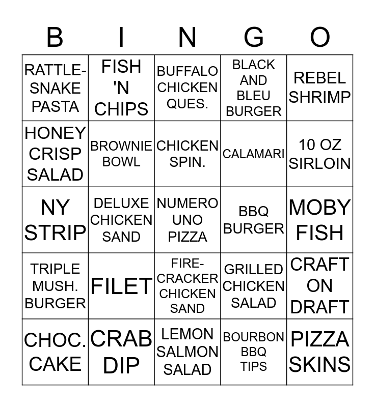This bingo card has a free space and 24 words: FILET, CRAB DIP, CHICKEN SPIN., CHOC. CAKE, REBEL SHRIMP, RATTLE- SNAKE PASTA, HONEY CRISP SALAD, FISH 'N CHIPS, BBQ BURGER, FIRE- CRACKER CHICKEN SAND, CALAMARI, NY STRIP, GRILLED CHICKEN SALAD, CRAFT ON DRAFT, BROWNIE BOWL, BOURBON BBQ TIPS, MOBY FISH, BUFFALO CHICKEN QUES., 10 OZ SIRLOIN, DELUXE CHICKEN SAND, PIZZA SKINS, TRIPLE MUSH. BURGER, BLACK AND BLEU BURGER and LEMON SALMON SALAD.