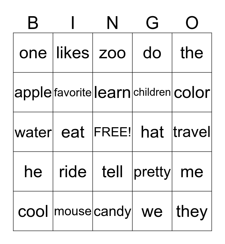 This bingo card has a free space and 44 words: a, they, and, cool, hot, we, zoo, door, the, mouse, do, hat, tell, ride, from, candy, for, water, many, color, likes, on, balloon, one, shoes, travel, fish, truck, pretty, he, not, me, blue, to, eat, jumps, how, watch, learn, apple, children, after, favorite and great.
