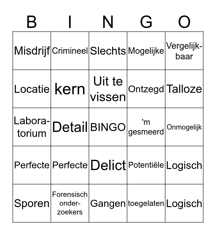 This bingo card has a free space and 24 words: Perfecte, Forensisch onder-zoekers, Uit te vissen, Sporen, Vergelijk-baar, Misdrijf, Locatie, Crimineel, 'm gesmeerd, Delict, Ontzegd, Labora-torium, Potentiële, Logisch, kern, toegelaten, Onmogelijk, Slechts, Talloze, Detail, Logisch, Perfecte, Mogelijke and Gangen.