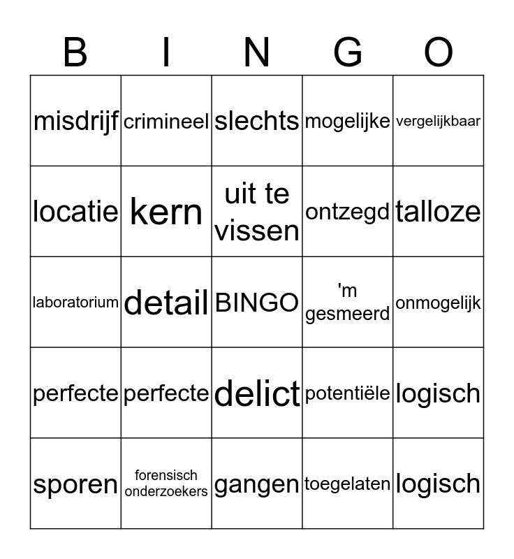 This bingo card has a free space and 24 words: perfecte, forensisch onderzoekers, uit te vissen, sporen, vergelijkbaar, misdrijf, locatie, crimineel, 'm gesmeerd, delict, ontzegd, laboratorium, potentiële, logisch, kern, toegelaten, onmogelijk, slechts, talloze, detail, logisch, perfecte, mogelijke and gangen.